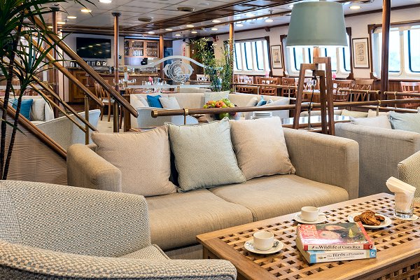 | Main deck Swimming platform, dining room - lounge bar area & library Cabin types: A | Click for larger view of the ‘Main’ deck |