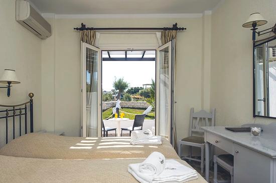 The hotel has 32 rooms and suites that combine modern luxury and traditional Cycladic style. All units have a balcony or terrace with sea or garden view, air-conditioning, mini bar, safe, phone, satellite TV, Wi-Fi, SH/WC or full bathroom, hairdryer.